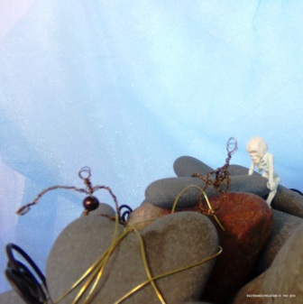 Restrained Pre-Stain IX – Rocks, wire basket and skeleton (found objects), along with original wire people