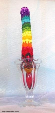 Leaning Tower of Rainbow Published August 19, 2016 at 218 × 448 Leaning Tower of Rainbow – 2015 – Polymer clay in upcycled glass – 12″ x 2″