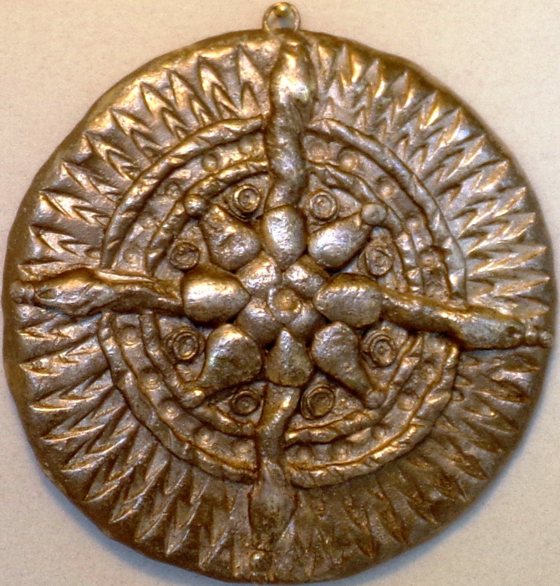 Spectercle-less M-004 Published August 25, 2016 at 1255 × 1315 in Pendants & Medallions ← Previous Next → Spectercle-less M-004 – 2016 – Polymer clay – 3 3/4″ Dropped the scary balls from this one….this design is based on an ancient phallic artifact